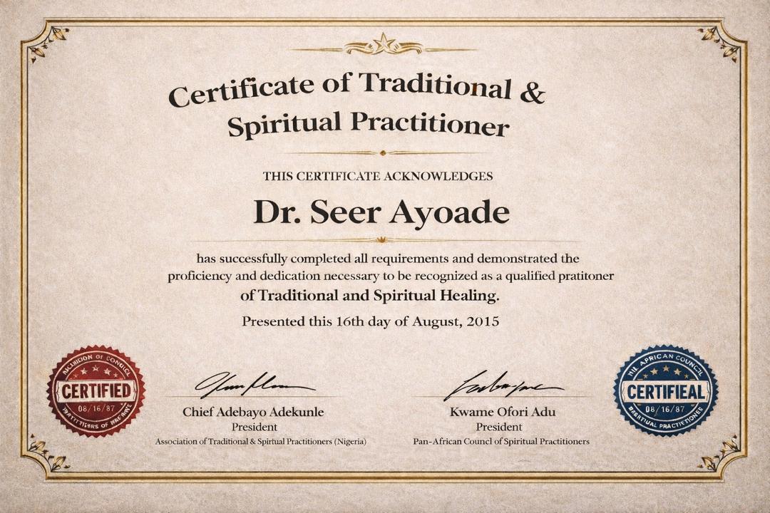 This certification represents more than a title, it reflects structured training, ethical responsibility, and proven traditional practice. Dr. Seer Ayoade operates with documented knowledge in traditional and spiritual healing, supported by disciplined study and cultural lineage. His work combines clinical awareness with ancestral intelligence, ensuring that every consultation, herbal preparation, and spiritual intervention is handled with structure, confidentiality, and precision.
